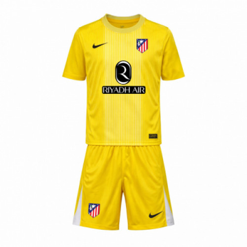 Детский вратарский комплект Atlético Madrid 2025/26: ярко-жёлтая джерси Nike с тонкими вертикальными полосами, чёрный свуш и герб клуба на груди, спонсор Riyadh Air по центру. Шорты в тон с белыми боковыми вставками, эмблемой «Атлетико» и логотипом Nike. Отличный вариант для тренировок и игр.