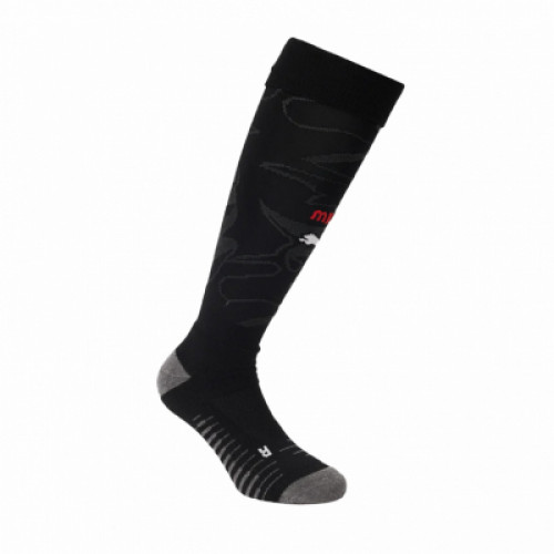 Футбольные гетры чёрного цвета с тонким жаккардовым рисунком. Усиленные зоны на пятке и носке серого оттенка, эластичная резинка сверху и поддержка свода стопы для комфортной посадки. Подходят для матчей и тренировок: хорошо держатся на ноге и отводят влагу.