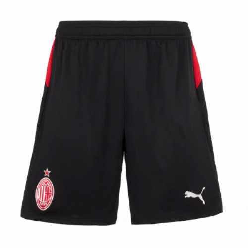 Домашние шорты AC Milan сезона 2025/26: базовый чёрный цвет с красными вставками по бокам, аккуратный минималистичный дизайн. На бедре — клубный герб «россонери» со звездой, напротив — логотип PUMA. Удобная посадка на резинке и лёгкая спортивная ткань — под матч, тренировки и повседневный спорт-стиль.