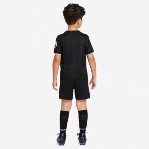 Детская форма с короткими рукавами ФК Тоттенхэм сезона 2025-2026 для выездных игр, черного цвета. Шорты черные. На груди и правом бедре украшена эмблемой клуба