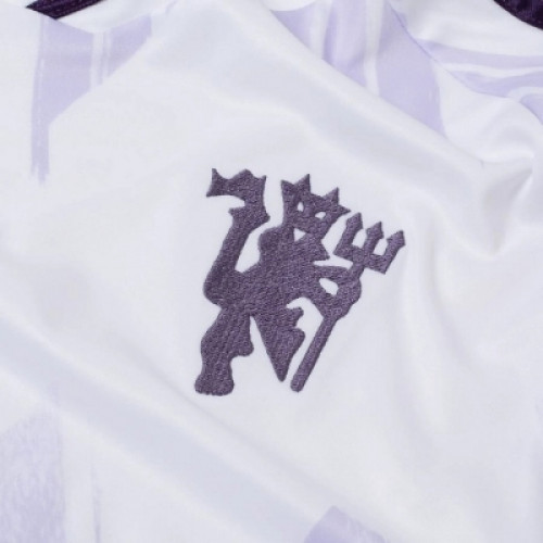 Гостевая футболка «Манчестер Юнайтед» 2025-2026 выполнена в белом цвете с лиловым узором и темно-фиолетовыми логотипами спонсоров и вставками на воротнике и плечах. Ключевые характеристики: Материал: Высококачественный, легкий полиэстер с технологией отвода влаги. Дизайн: Выполнен в современном или винтажном стиле (в зависимости от конкретного дизайна , отличный от красного домашнего цвета. Рукава: Длинные, часто с манжетами для плотной посадки. Назначение: Идеальна для игры, тренировок или повседневного ношения в стиле стритвир.