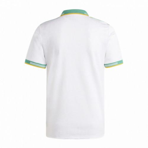 Резервная форма ФК «Рома» в винтажном ключе: чистый белый фон, поло-воротник и контрастные зелёно-жёлтые акценты на вороте, плечах и манжетах. На груди — монограмма ASR и логотип adidas Originals. Лаконичный ретро-дизайн для матчей и повседневного фан-стиля.