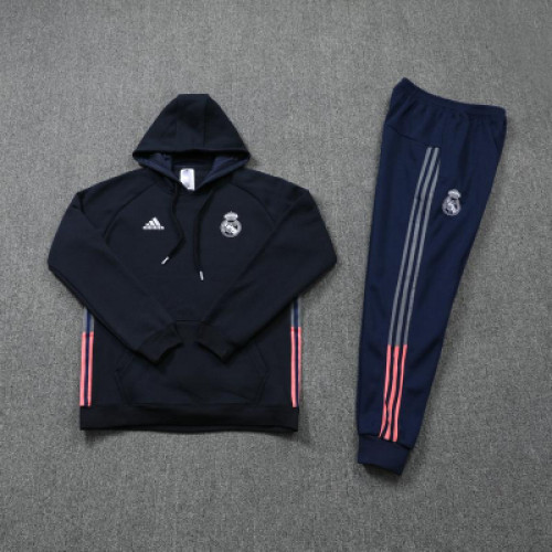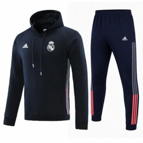 Костюм Real Madrid в тёмно-синем цвете - худи с капюшоном и брюки в одном стиле, выглядит строго и аккуратно. Белая символика клуба и классические полосы по бокам делают образ узнаваемым, а коралловые акценты на штанинах добавляют яркости без перегруза. Отличный вариант на каждый день, для прогулок и тренировок в прохладную погоду, хорошо сочетается с кроссовками и базовыми футболками.